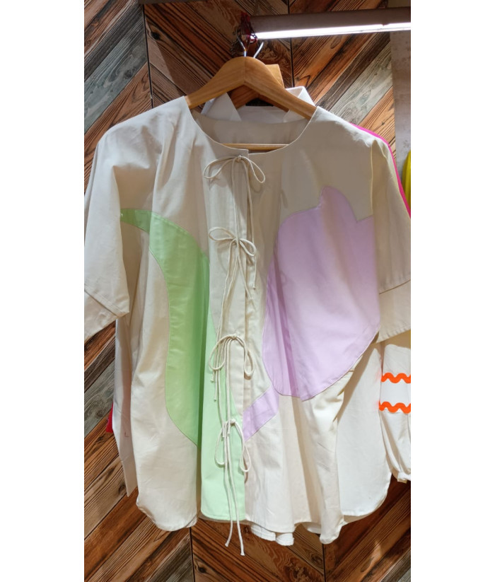 | Plain solid loose fit cotton tunic style shirt with tie-up detailing on the front. Features color patches on both sides with loose sleeves. Off white with green lavender detailing. Length 26 inches. Colors and customization available. |