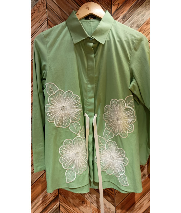 | Solid pista green cotton shirt with off white hand embroidery patches and satin tie-up lace. Length 26 inches. Colors and customization available. |
